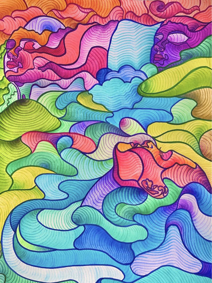 Heavily inspired by Art Nouveau and surrealism, Amber explores evolution and reflection through shapeless and feminine forms. Common among her work are bold strokes that mirror her passion, intricate details that hint at a reflective nature, and splashes of color that embody hope and resilience. Her work inspires the observer to become lost in clashing colors and shapes flowing in different directions while embracing the warmth and calmness that coexist with the chaos invoked by the vibrant colors. The movement invoked by the vibrant colors, gradients, and curved lines in and around "The Woman" represent an embracing of unfettered evolution that is chaotic and enrapturing. Her work has been featured at the 2024 NYC Art Expo and the Atlantic Gallery in Chelsea.